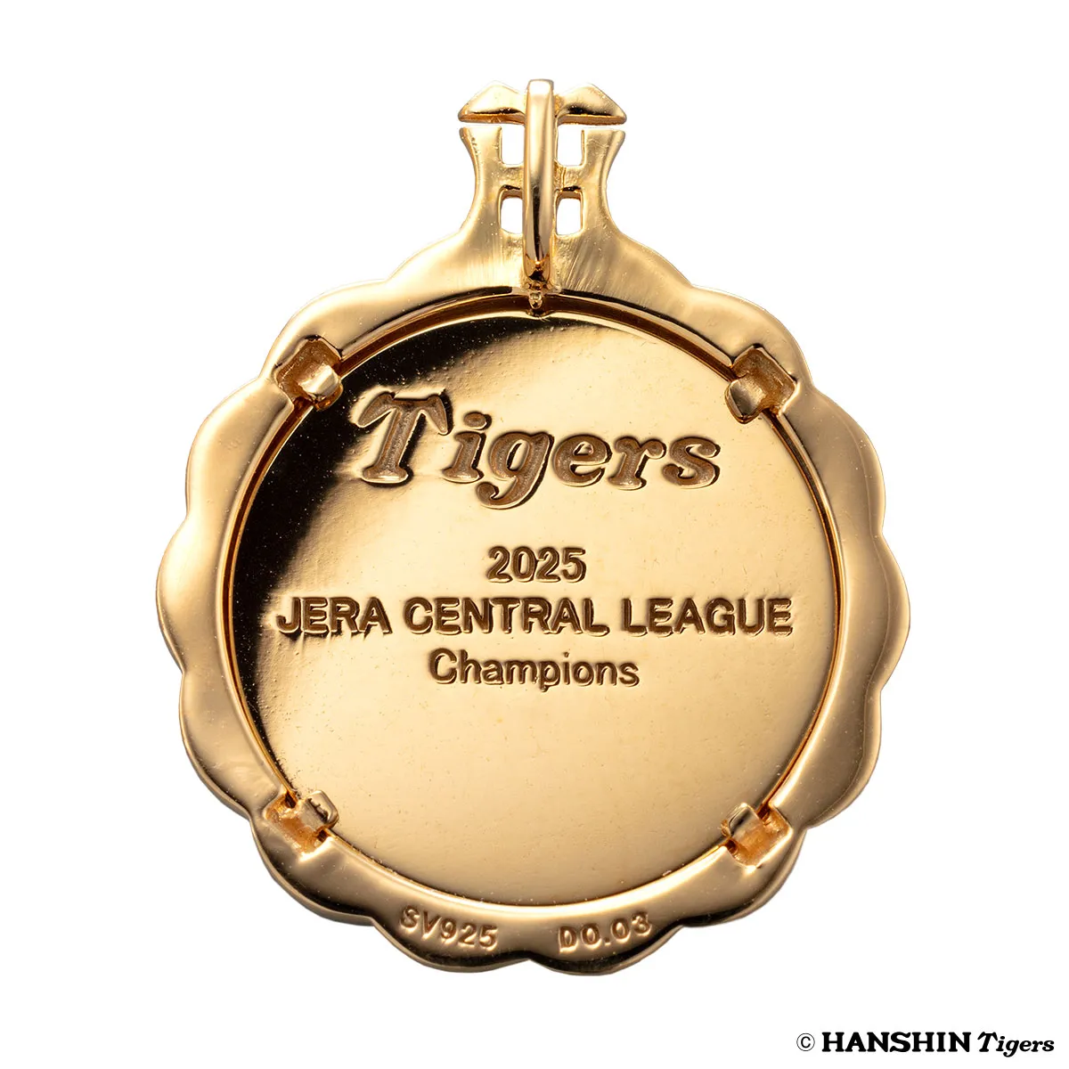 ペンダントの裏面には、タイガースの球団ロゴと優勝記念の銘が刻印されています。