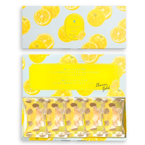 柑橘の爽やかな風味、季節限定の湘南ゴールド味のココン。神奈川県で生まれた柑橘、湘南ゴールドのピューレを使用し、オレンジシロップとともに柑橘の爽やかな風味が広がります。限定パッケージも夏らしく、贈り物にもおすすめです。