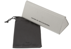 メガネ、サングラス共通で、オリジナルメガネケースとメガネ拭きが付いてきます。ケースは60%、メガネ拭きは100%リサイクル素材を使ったサステナブルに配慮したセット。ケースは折りたたみ式になっており、巾着タイプのメガネ拭きと合わせて使い勝手のよい仕様です。