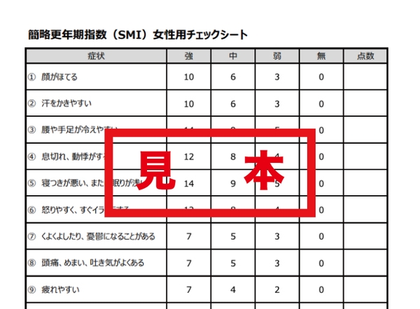 女性の場合は、「簡略更年期指数(SMI:Simplified Menopausal Index)」で更年期の症状の程度を判断します。顔がほてる、汗をかきやすい、頭痛がよくあるなど、女性の更年期でよくみられる症状が判断項目として設けられています。