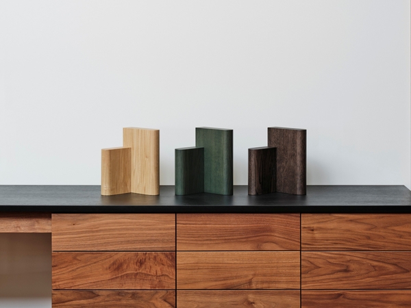 素材には、国産のクリ材を使用。カリモク家具の製造工程で発生する短尺材は家具用材として使うには短く、普段は表からは見えない内側に利用されています。今回のブックエンドではそういった短尺材を主材として用いることで、日本の森から出材する個性豊かな木材を余すところなく有効に活用しています。