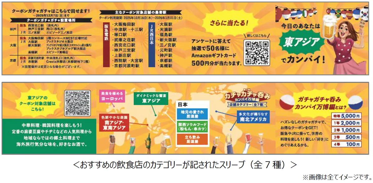 昨年度は、「ガチャガチャ呑み エモい居酒屋編」を開催し大変ご好評をいただきました。第2回となる今回は「万博」をテーマに、“世界を味わう体験”を両社沿線の飲食店で楽しんでいただけるよう、日本や東アジア、ヨーロッパなど多彩なジャンルの全48店舗を対象としました。また、新しい食文化にもチャレンジしていただけるよう、クーポンの当選金額の上限を前回の2,000円から5,000円に大幅に引き上げました。