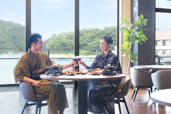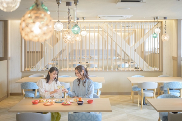 また、白を基調とした地中海リゾートを思わせるラグジュアリーな雰囲気のスパガーデン(中庭)からは足湯や温泉プール、ベンチが設置され、ラウンジのドリンクを片手に美しいサンセットを楽しめます。マリンテイストのレストランでは海鮮メニューを中心に豪華なご当地グルメバイキングをお楽しみいただけます。