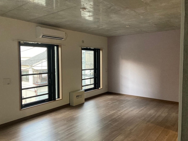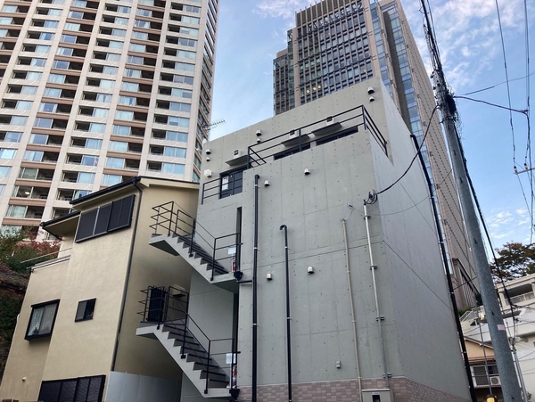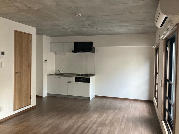 2022年9月に完成したばかりの新しい物件。コンクリートのモダンな外観、お部屋も天井がコンクリートで大人っぽい雰囲気。エステ利用可能、ペットも飼育可能だ。コンクリートを中心とした色味の中で壁の一面がラベンダー色になっていてアクセントになっている。エレベーターはなく、3階までは階段のみ。