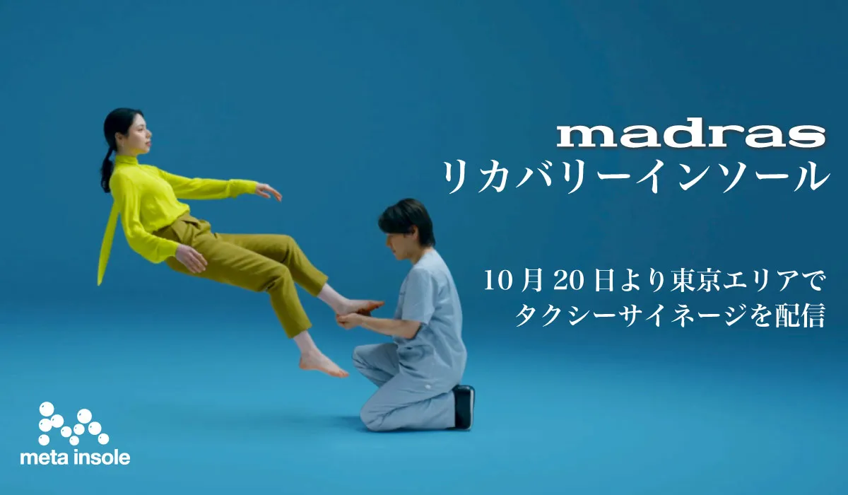 タクシーサイネージでは、この指圧作用による心地よさを浮遊感のある映像で表現。ビジネスやレジャーなどで歩き疲れて乗車したお客様に、心地よい刺激とともに履くだけで疲労回復につながるmadrasリカバリーインソールの魅力をお伝えしてまいります。