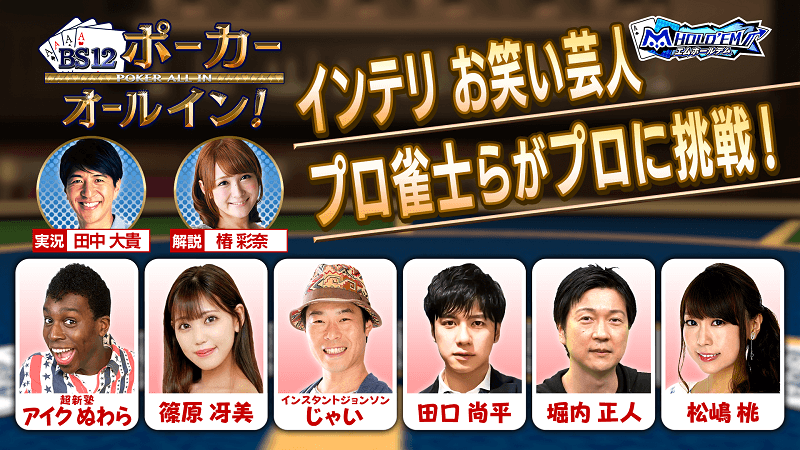 全国無料放送のBS12 トゥエルビ( 本社:東京都渋谷区、代表取締役社長:須磨直樹)は、スマホアプリゲーム「m HOLD‘EM」を使ったポーカー対決番組「BS12ポーカー オールイン!」を放送しております。2月26日はお笑い芸人、プロ雀士、アナウンサーがプロポーカープレイヤーに挑戦する様子をお届けします。