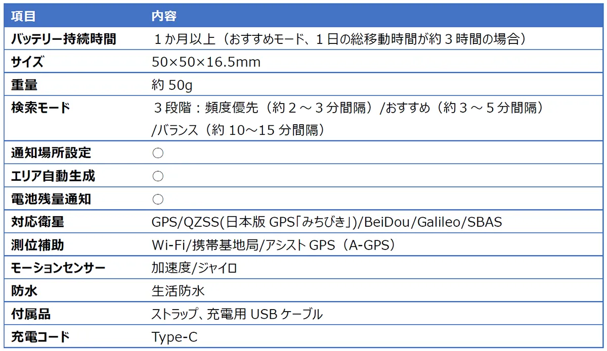 ミマモルメGPS2は、サイズ・重量は現行端末とほぼ同等ながらバッテリー容量を約3倍に増加し、充電無しで1か月以上の連続稼働が可能です。また、現行端末の測位方式に加え、アシストGPS(A-GPS)を搭載したことで、より素早く正確な位置の特定を可能としました。