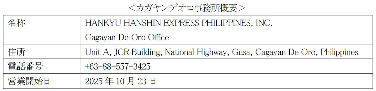 阪急阪神エクスプレス(本社:大阪市北区 代表取締役社長:谷村 和宏)のフィリピン法人である HANKYU HANSHIN EXPRESS PHILIPPINES, INC.(本社:マニラ)は、フィリピン・ミンダナオ島北部の中心都市であるカガヤンデオロ市に新たに事務所を開設し、10月23日より業務を開始します。