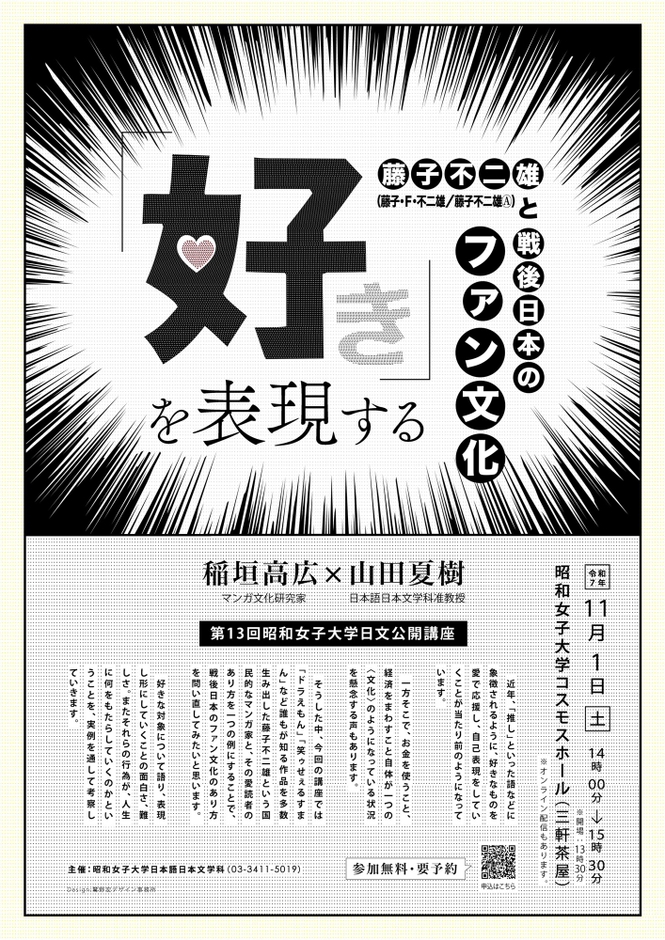 昭和女子大学(学長 金尾朗:東京都世田谷区) 人間文化学部 日本語日本文学科は、第13回公開講座「「好き」を表現する 藤子不二雄(藤子・F・不二雄/藤子不二雄Ⓐ)と戦後日本のファン文化」を11月1日に開催します(参加費無料)。国民的なマンガ家、藤子不二雄とその愛読者のあり方を一つの例に戦後日本のファン文化のあり方を考えていきます。