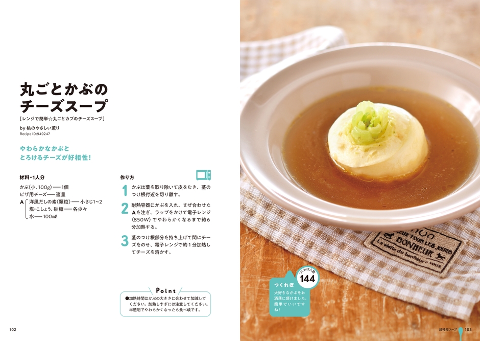 料理レシピ投稿サイト”クックパッド”の膨大なレシピのなかから、「スープ」をテーマに厳選したレシピを収録しました。主菜に合わせたいあっさりシンプルなものや、一品で満足のボリュームたっぷりなおかずスープまで幅広く紹介しています。