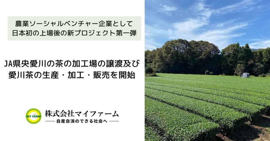 「自産自消のできる社会」を理念に掲げる株式会社マイファーム(京都府京都市、代表取締役:⻄辻 ⼀真)は、本日2023年12月1日より、JA県央愛川が保有する茶工場の譲渡を受け、神奈川県愛甲郡愛川町における茶の生産・加工・販売事業を来年度より開始いたします。