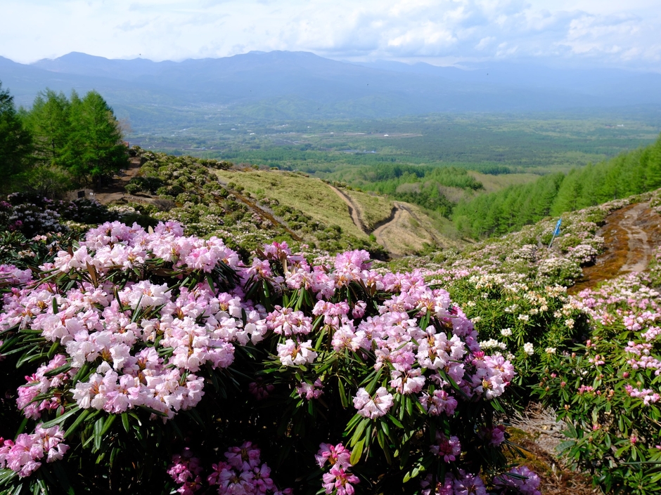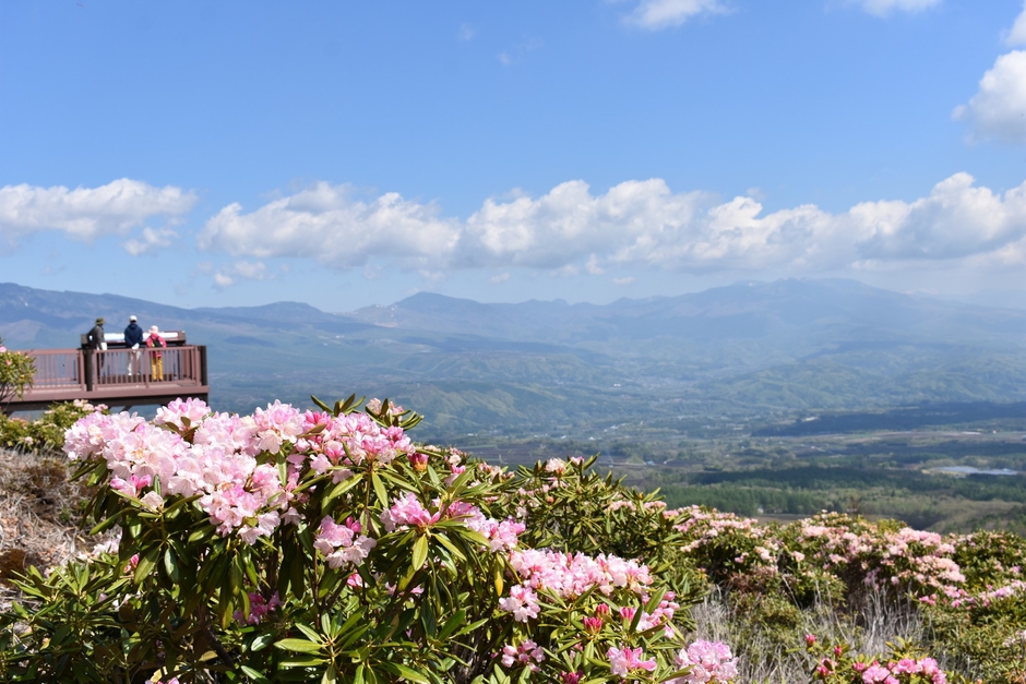まつりの舞台は、三ツ尾根山麓に広がる浅間高原シャクナゲ園。ここは、標高1,500mに位置し「天空の花畑」と呼ばれています。晴れた日には、浅間高原を眼下に、奥には谷川連峰や横手山などを望む大パノラマが広がります。