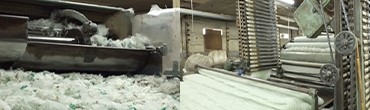 ・綿状になった原料と再生ポリエステルを混ぜ合わせ、糸の元が作られます。