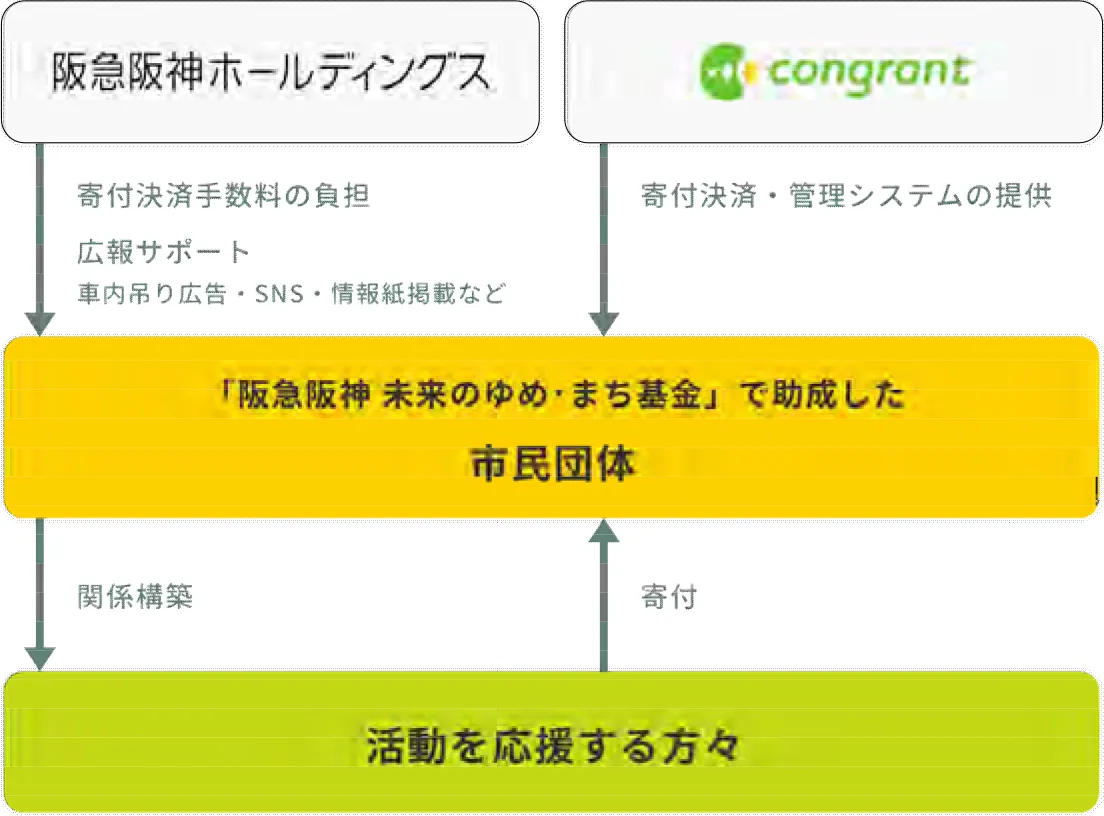 クラウドファンディングの対象となる市民団体は、「阪急阪神 未来のゆめ・まち基金」の助成団体のうちの10団体※で、目標金額は1団体あたり最大50万円です。当社は、阪急電車・阪神電車への車内吊り広告や公式SNSなどを活用して広報をサポートするとともに、市民団体に寄付の全額が届くよう決済時の手数料を負担します。また、コングラントと連携し、資金調達に関する勉強会やアドバイスを行います。クラウドファンディングを実施することで、市民団体にとって継続的な資金調達のきっかけとなり、将来にわたり活動ができるようにサポートしていきたいと考えています。