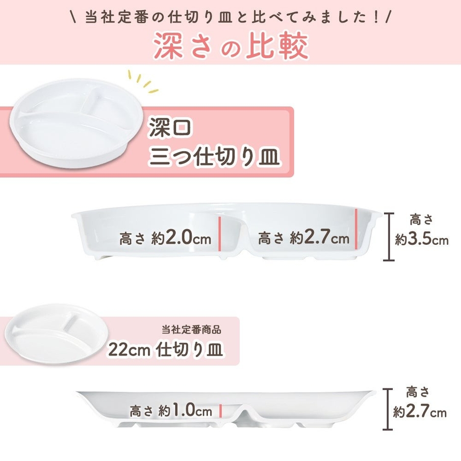 3つに仕切られていて、ごはん、おかず、デザートを、この一枚のプレートに盛りつけられ、深さがあることで料理の味が混ざらず、おいしく食事ができます。
