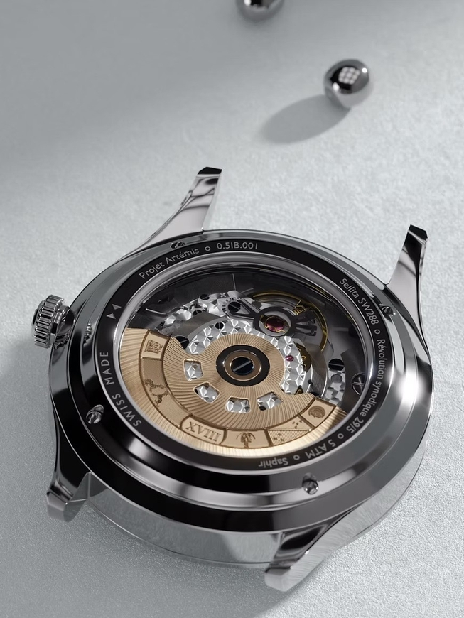 また、「ORIGIN」のムーブメントには17世紀のタロットカードに着想を得た特製ローターには、2匹のオオカミ犬、塔、ザリガニ、そして月が精緻に刻まれています。古の象徴が静かに回転するその姿は、時の流れとともに“月の神秘”を語り続け、時計に芸術的な深みと高級感をもたらします。