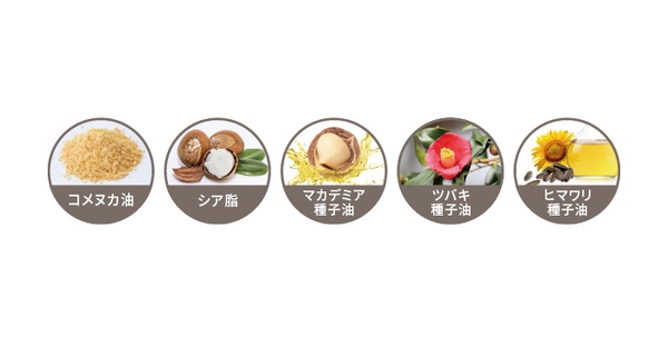 コメヌカ油、シア脂、マカデミア種子油、ツバキ種子油、ヒワマリ種子油の植物性オイルが髪を包み込み、しっかりと保湿します。