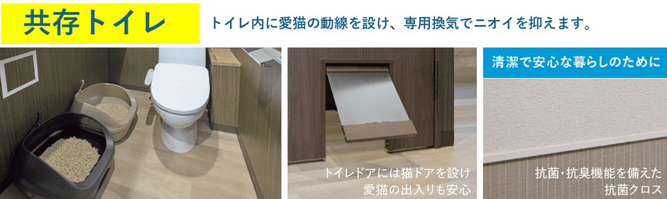 住居の玄関前に二重扉の設置や、猫が開けにくいノブ形状を採用するなど、飛び出しや脱走を防ぐ設備を備えるほか、壁のコンセントは床から50cmの高さを確保し、愛猫のイタズラやスプレー行為(※)等によるトラブルを防ぐなど安全にも配慮しています。