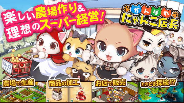 『がんばれ!にゃんこ店長』は、可愛いにゃんこたちの世界で楽しめる、農場作り × スーパー経営シミュレーションゲームです。