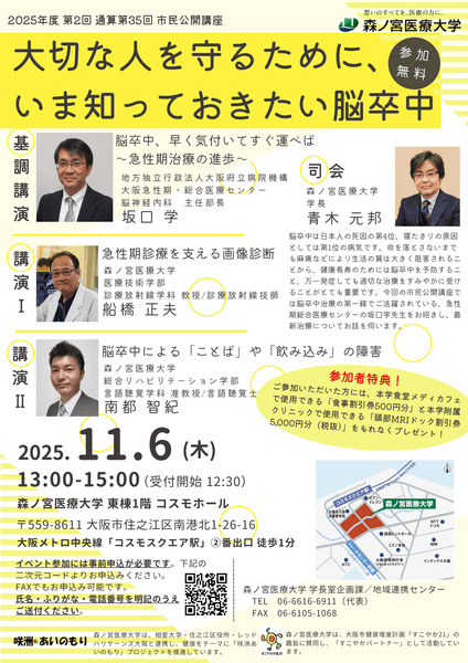 森ノ宮医療大学(大阪市住之江区、学長:青木元邦)は、11月6日(木)に2025年度第2回市民公開講座を開催します。今回は、日本人の死因の第4位、寝たきりの原因としては第1位の病気といわれている「脳卒中」をテーマとし、大阪急性期・総合医療センターの専門医をお招きしてお話を伺います。また、急性期の診療を支えている画像診断、脳卒中により起こる言語障害などについて、本学診療放射線学科、言語聴覚学科の教員が詳しく分かりやすくお伝えする予定です。是非ご参加ください。皆様のご来場をお待ちしております。