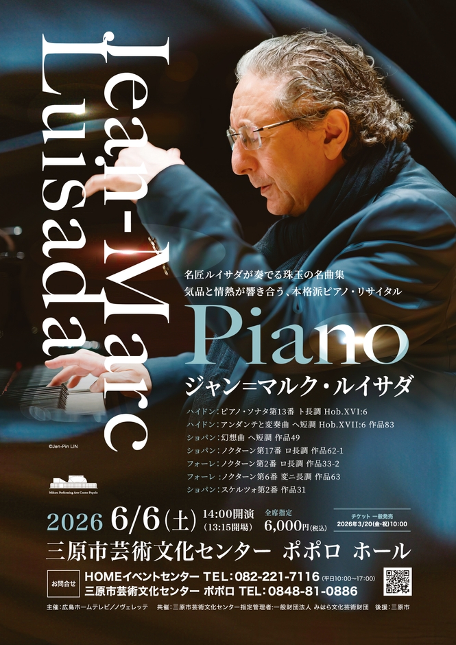 広島ホームテレビ(本社:広島県広島市中区白島北町19-2)は、2026年6月6日㈯に三原市芸術文化センター ポポロにおいて、フランスを代表するピアニスト、ジャン=マルク・ルイサダによるピアノリサイタルを開催します。気品と情熱に満ちた本格派の演奏をお楽しみください。