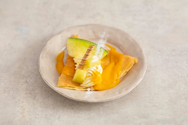 もちもち食感の焼きたてクレープになめらかなマンゴークリームと甘くジューシーな鉾田産メロンをトッピング。