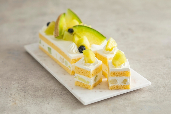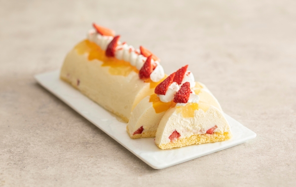 爽やかなオレンジのムースでマンゴーや洋梨、いちごを包みこみました。