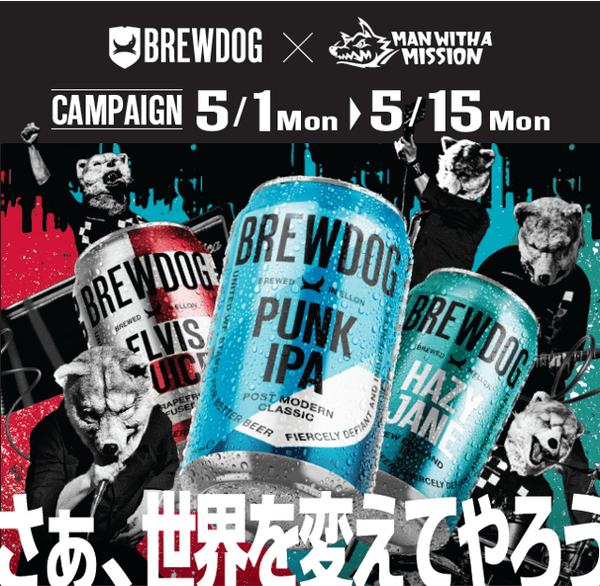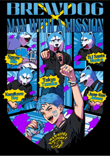 当キャンペーンでは、最高に“PUNK”なビールBREWDOGと、究極の生命体MAN WITH A MISSIONがコラボレーションしたアイテム(BREWDOGのファンイラストレーターOKADA氏のデザイン。MAN WITH A MISSIONの各メンバーをあしらった、Tシャツ、タオル、そしてステッカー)のプレゼント(スクラッチカードくじ)を企画しております。この機会に是非BREWDOGをお楽しみください。