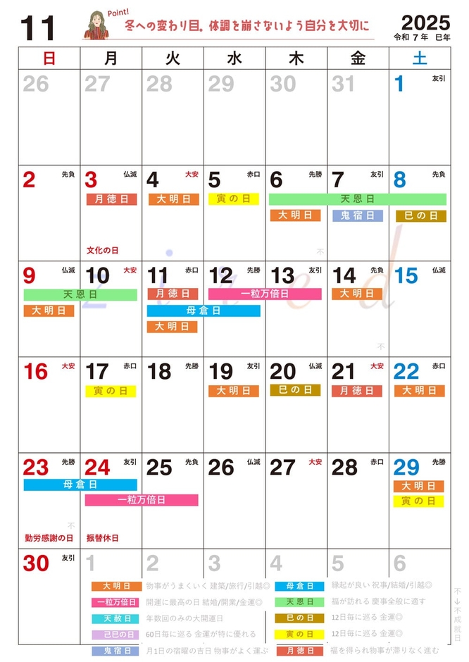 11月の縁起の良い開運日がひと目でわかる!吉日カレンダー画像