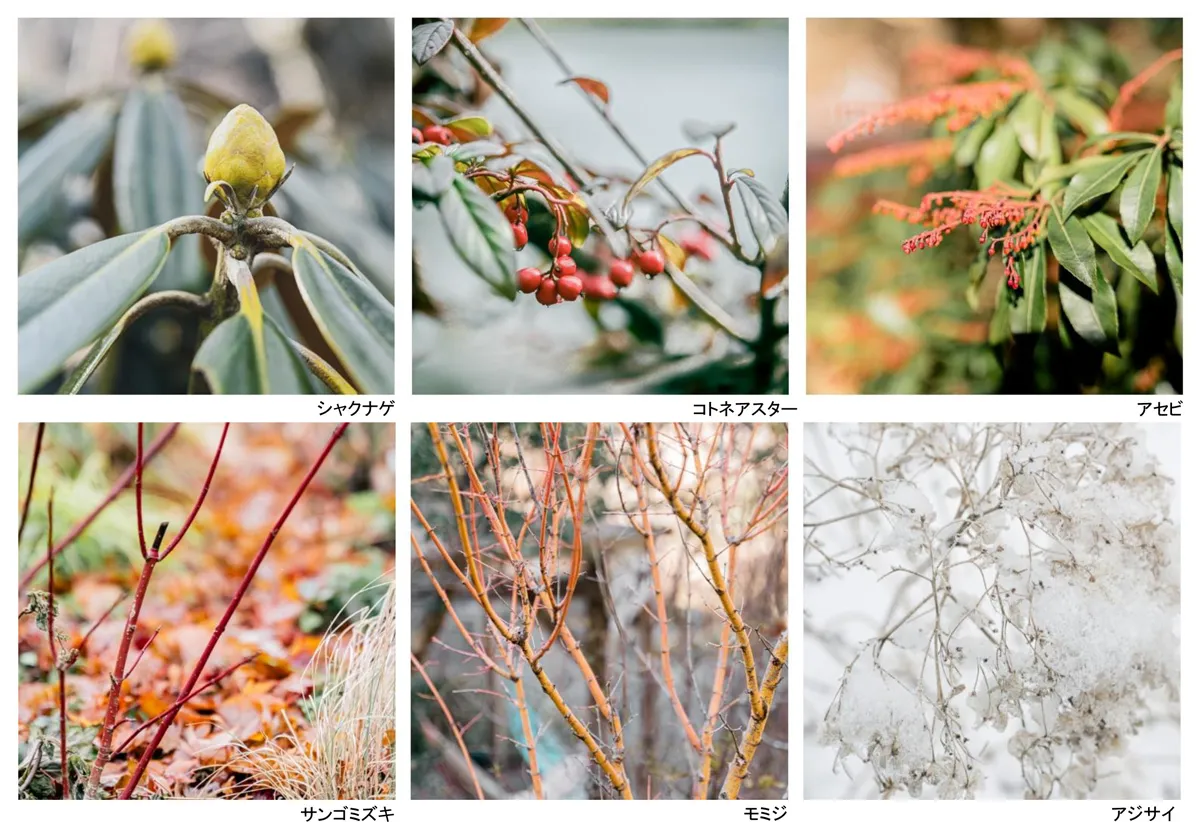常緑樹と雪のコントラストや、秋から残る木の実や花の種にも注目し、特に冬に色づく枝ぶりの美しい樹木などで構成された庭園デザインを指します。