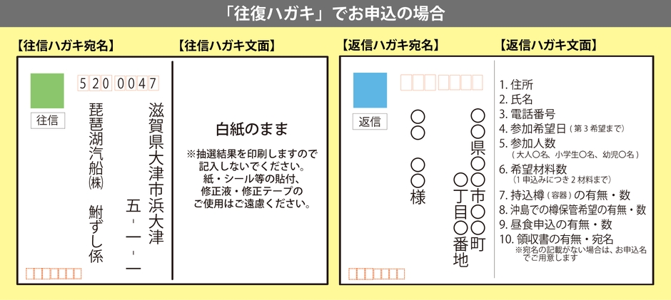 往復ハガキの場合…5月31日(土)必着数量限定につき、申込多数の場合は抽選となります。