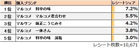味噌の1位は「マルコメ 料亭の味」で、同カテゴリのレシートシェアは7.2%でした。購入理由では、「いつも買っている」、「家族が気に入っている」、「ブランド・企業イメージがよい」などが挙げられており、具体的なコメントでは「だし入りで手軽。家族が、これでないとだめだから毎回購入しています。市販の味噌の中でも1番使いやすく味にくせがない。」(30代女性)、「長年お味噌は、マルコメの料亭の味を愛用しています。家族の評判が良いので購入しました。」(50代男性)といったようにロイヤルユーザーの声が見受けられました。