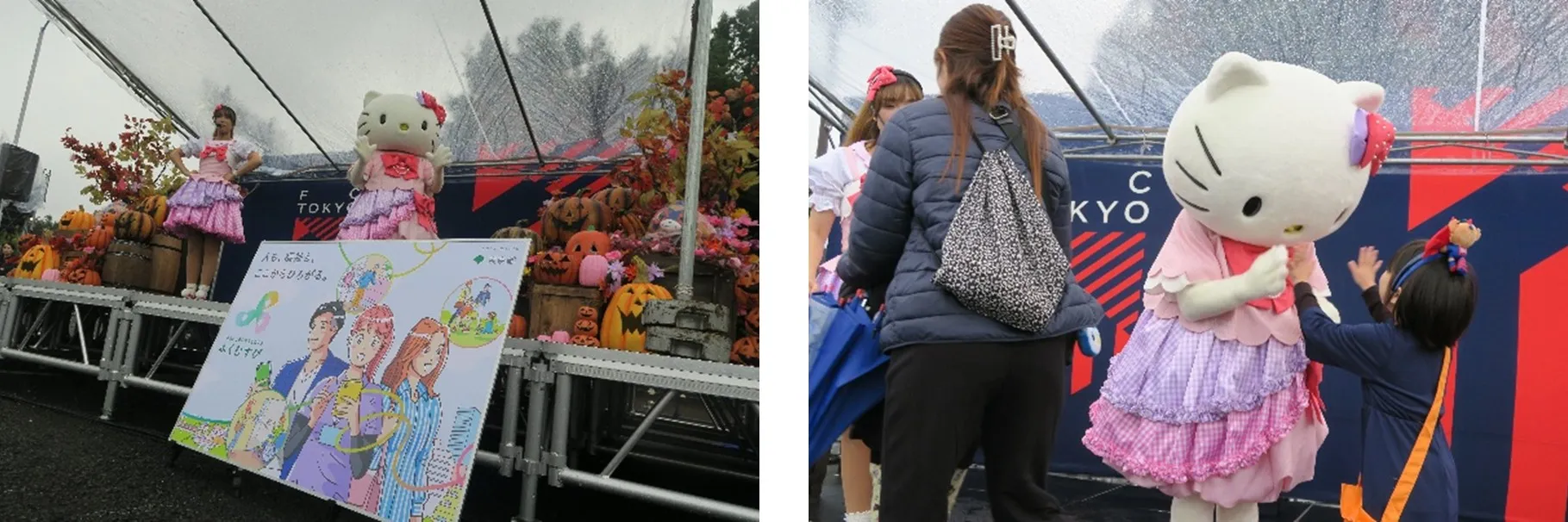 ブース横に設置されたハロウィン仕様の特設ステージには、「TOKYO福祉のお仕事アンバサダー」を務めるハローキティが応援に駆けつけました。小雨が降る状況にもかかわらず、大勢のサポーターが集結し、特設ステージは大いに盛り上がりました。特にハイタッチ会は、子どもから大人まで長蛇の列ができるほどの大盛況となり、ハローキティとの触れ合いを通じて、「ふくむすび」や福祉のお仕事について理解を深めていただく貴重なステージイベントとなりました。