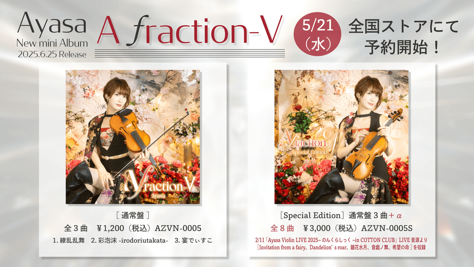 通常盤の3曲に加え、『Ayasa Violin LIVE 2025~のんくらしっく~in COTTON CLUB』より特別ライブ音源を追加収録したスペシャルバージョン。