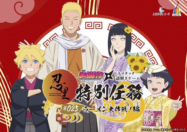 『NARUTO-ナルト-』『BORUTO-ボルト- NARUTO NEXT GENERATIONS』のキャラクターたちのオリジナルストーリーを体験しながら、謎解きゲームに挑戦する 特別イベントの第25弾。今回の特別任務は、『BORUTO-ボルト- NARUTO NEXT GENERATIONS』の世界をベースに、うずまきナルト一家4人のオリジナルストーリーを体験することができます。家族の絆を体験しながら、 謎解きゲームに挑戦しましょう。任務に参加された方には、書下ろしキャラクターのオリジナルアクリルキーホルダーをランダムで1つプレゼントいたします