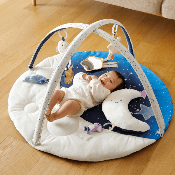 ”見る・触る・聴く”を遊びながら育む♪夜空をイメージしたお月さまのプレイジム。 キラキラのお星さまや動物たちのおもちゃが5個もついて、遊び放題!おもちゃは取り外しができるから、おでかけのおともにもなりますよ。 赤ちゃんを見守っているような、ニッコリ笑顔のお月さまクッションは大人も癒されます。