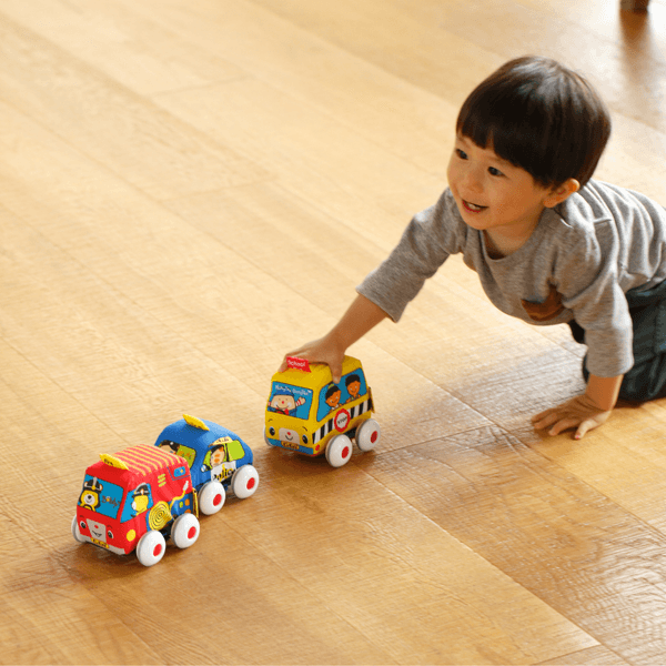開発当時、クルマのおもちゃのほとんどが大きい子向けだったため、幼児も安心して遊べるクルマのおもちゃを作りたい、というメーカーの想いから誕生しました。クルマの動きが幼児の追視と空間認知のトレーニングに。引き戻すという動作で、幼児の総合的な運動能力を促すだけでなく、物事の原因と結果の理解にもつながります。布のパーツは取り外して水洗いできるのもうれしいポイント!