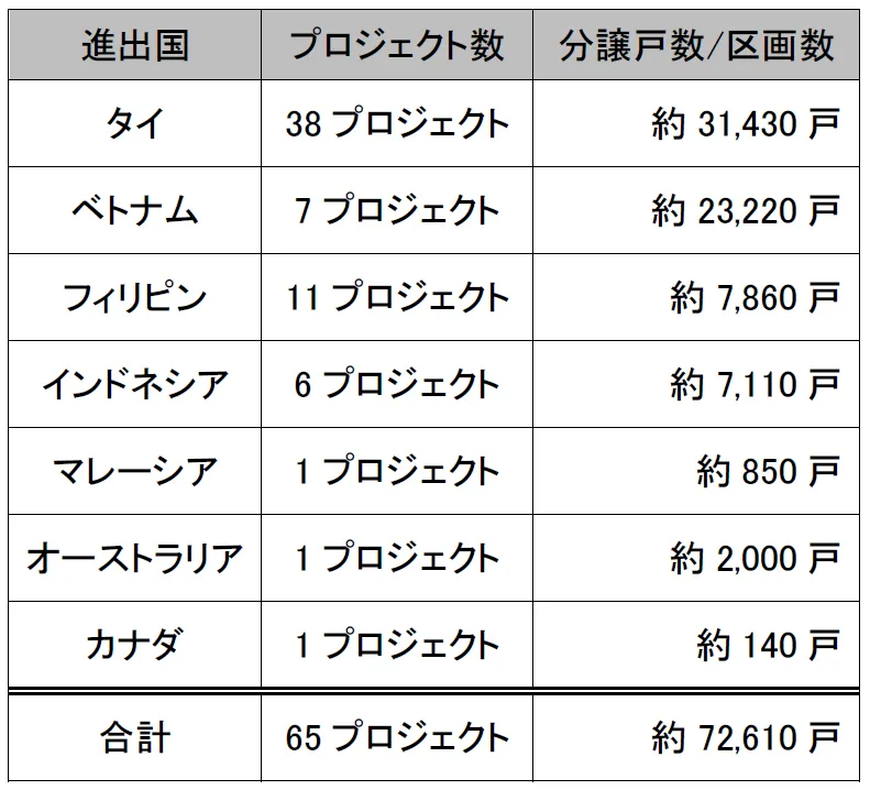 当社は現在、ASEAN諸国を中心に海外不動産事業を強化しています。今回のプロジェクト参画により、住宅分譲事業の実績は総計で65プロジェクト(約72,610戸)に達しました。