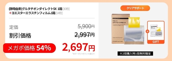 スペシャルイベント② メガポ限定!「エラスチンオリジナル7X」3箱購入時、「(酵母由来)グルタチオンダイレクト5X」の場合は2箱購入時、同じ商品1箱無料プレゼント!