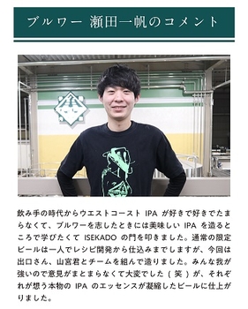 クリアなオレンジの外見にアルコール7.0%、IBU65のウエストコーストIPAの黄金比で仕上げました。ホップの香りをより際立たせるために、ボディ感は残しつつもモルト由来のアロマフレーバーを必要最低限になるよう仕込み工程とモルト配合に工夫を施しました。ホップは「いつものISEKADOと違い感じる」「アロマでハッとさせたい」をテーマにメインにはベリーやスイートフルーツ、ダンクなニュアンスが特徴のストラータを採用しています。またストラータ以外にもダンクなニュアンスを与えるホップを配合してアロマとフレーバーに厚みを持たせました。
