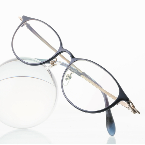 フロント一体成型で耐久性があり、すっきりした印象をもつ洗練されたデザイン。フロントはバイカラーになっており、角度によって異なる表情を楽しめます。内側に施された金色がお顔を明るくうつします。