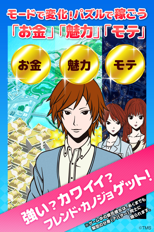 パズルのステージクリアで貯まる「お金」と「魅力」で、フレンドや彼氏彼女とデート(パズル)を重ね関係を築くゲームです。