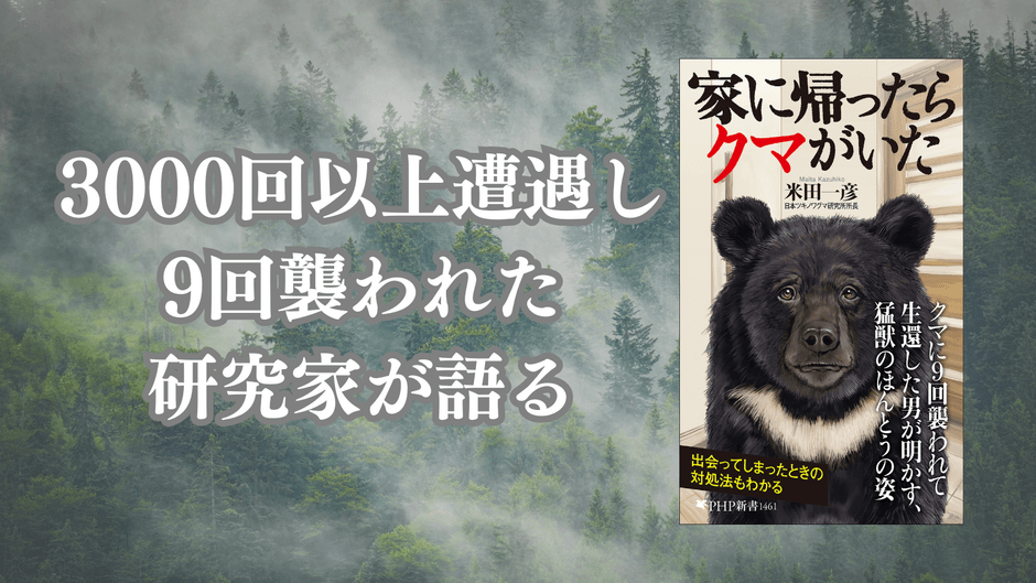 株式会社PHP研究所(京都市南区・代表取締役社長 瀬津要)は、PHP新書『家に帰ったらクマがいた』(米田一彦著/税込1,320円)を2026年4月17日に発売します。著者の米田一彦氏は、秋田県生活環境部自然保護課に1986年まで在職し、通算50年以上クマを追い続ける研究家です。クマとの遭遇3000回以上、9回襲われて生還した猛者が紹介する研究成果と日常生活を通じ、"駆除か保護か"という二項対立に一石を投じます。ほんとうのクマの姿や、鉢合わせてしまったときの対処法を学び、本来あるべき自然の姿を考えさせる科学ノンフィクションです。