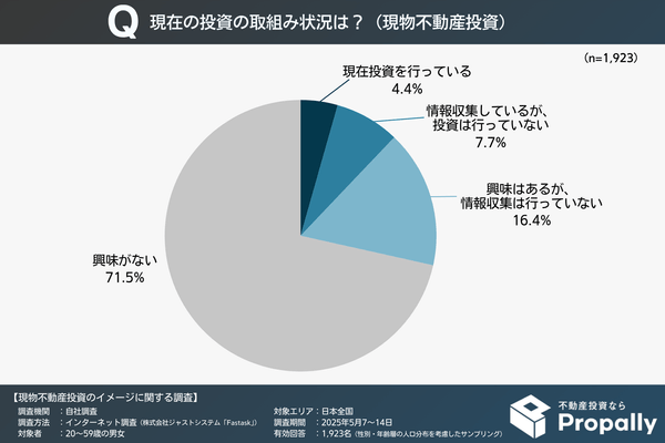 現物不動産投資に対して「興味がない」と回答した人が71.5%と最も多く、約7割を占めています。一方、「興味はあるが情報収集は行っていない」は16.4%、「情報収集しているが投資は行っていない」は7.7%、「現在投資を行っている」は4.4%となっています。