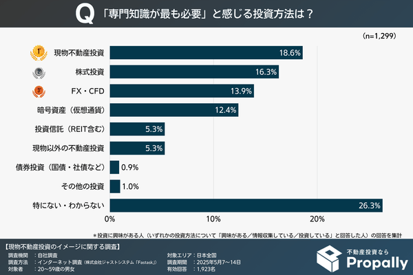 現物不動産投資が上位となったのは、物件評価や収益計算、税務知識などの専門的な知識が必要とされるイメージがあるためと考えられます。同様に株式投資も、企業分析や経済指標の読み解きなどの専門知識が求められるイメージが強いようです。