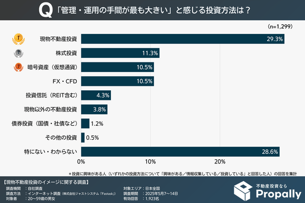 「最も管理・運用の手間が大きい」と思う投資方法として、現物不動産投資を挙げた人が29.3%と最も多く、2位の株式投資(11.3%)を大きく引き離す結果となりました。3位は暗号資産(10.5%)、同率でFX・CFD(10.5%)と続き、現物不動産投資が突出して「手間がかかる」というイメージを持たれていることが分かります。