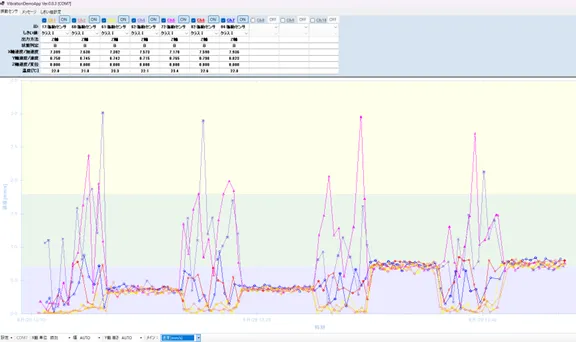 JIS B 0906の機械振動の状態を評価する指標をもとに、振動センサが設置された設備の状態を故障リスクのレベル別にグラフで可視化。最大10台のセンサで同時監視が可能です。