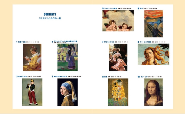 目次で本書のアート作品10点の完成した状態がご覧になれます。その中から好きな作品を一つ選びましょう。同時に複数の作品を始めてしまうと混同する恐れがあるので、一つずつ仕上げていくことをおすすめします。また、後ろにいくほどシールが細かく難しくなっていきますので、比較的シールが大きく貼りやすい前の作品から始めて、感覚をつかんでいくといいでしょう。