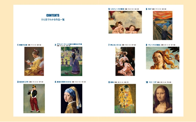 アート作品のページには、台紙となる10点の作品が難易度の低いものから順に収録されており、その後ろに、各作品を完成させるためのシールが順番に収録されています。作品を選んだら、街頭するシールのページを探して貼りつけていくだけです。