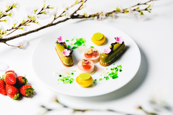 ストロベリーピスタチオ、桜ピーチ、桜ストロベリーの球体など春の到来を感じさせるピンクカラーと新緑の緑を表現したスイーツが揃います。